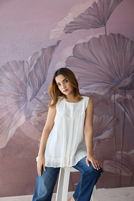 Easy to wear, this cool top features a gentle flare, gathered hemline, and a subtle geometric hand cut Applique front yolk. The back of the top is embroidered with detailed French knot like stitches know as ‘Turra’ in chikankari family. Pair it with a cool pair or denim jeans, skirt or linen pants.