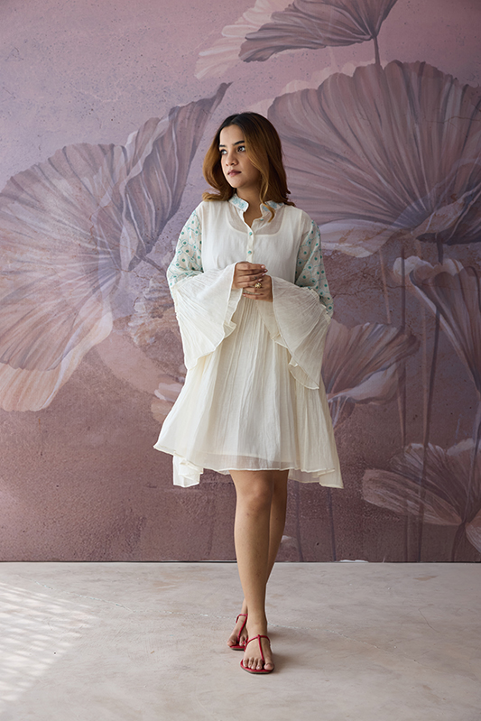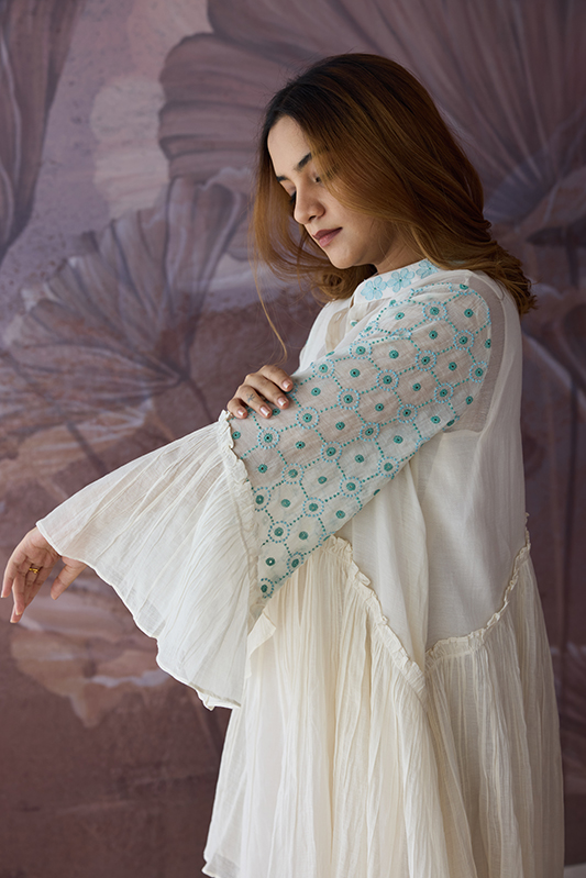This dress is hand crafted with cool shades of sea green and blue Resham threads on the collar and sleeves. The gathered frill sleeves make the dress a lot of fun. Cute Chikankari buttons down the front placket add the right detailing.
