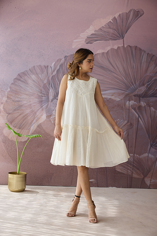 A sleeveless gathered dress with a delicately hand cut Applique work Neckline / bodice, front and back.
