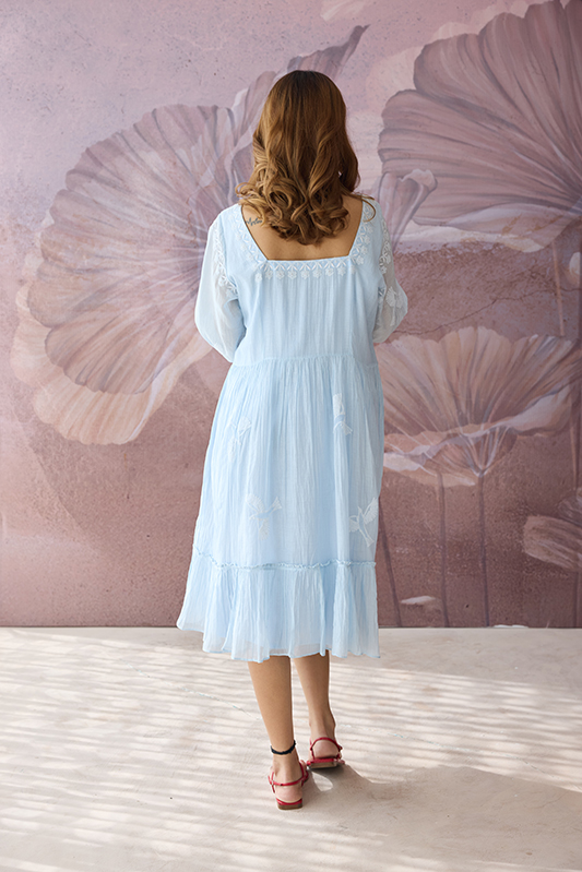 A light, graceful two tired gathered dress with beautifully handcrafted Chikankari Bird motifs. Using the Bakhiya stitch and neatly done ‘Jaali’ work the birds are a delight to look at.