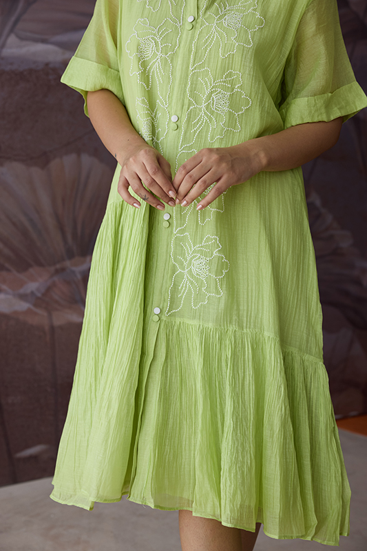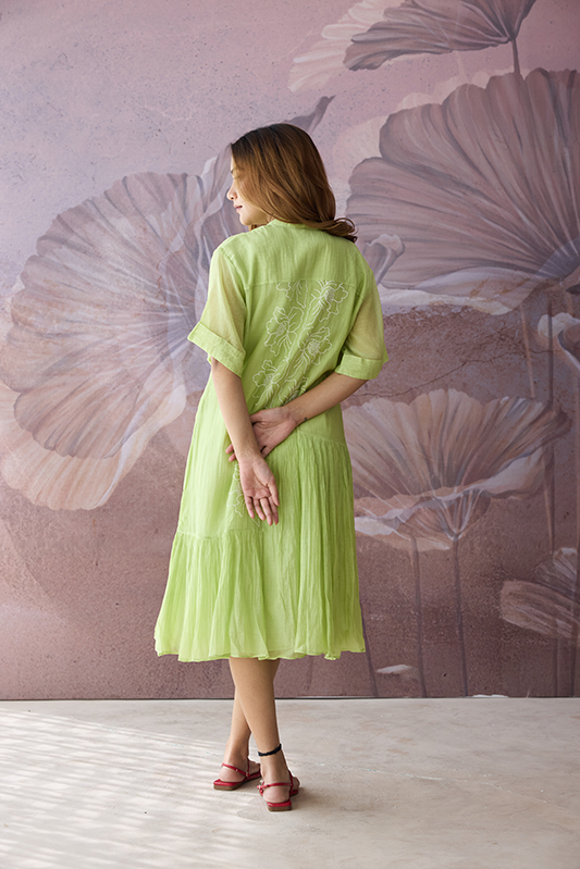 An easy silhouette with gathering in panels. The dress has drop shoulder sleeves and delicate hand embroidered Hibiscus floral motif’s. A perfect dress for the hot summer days!